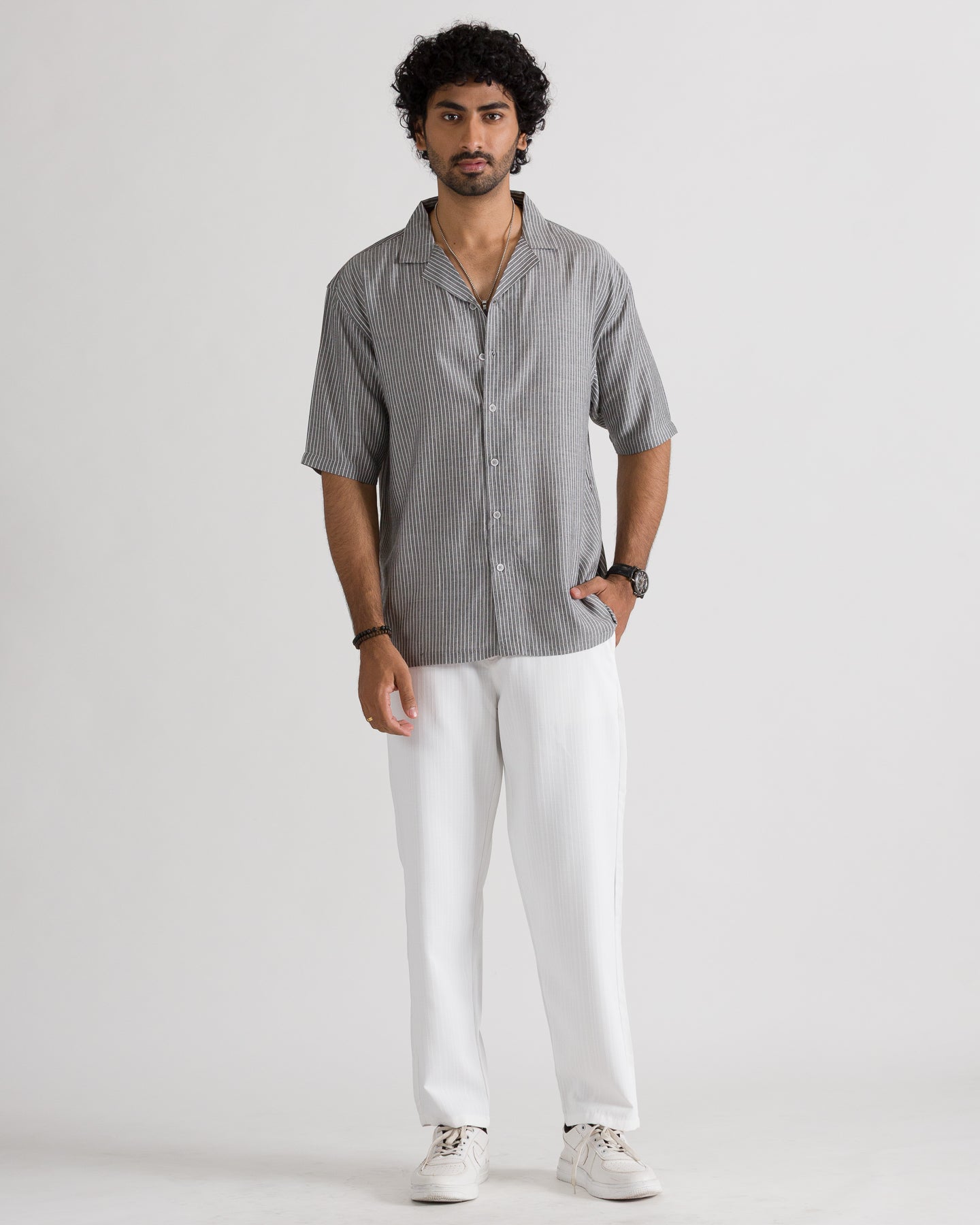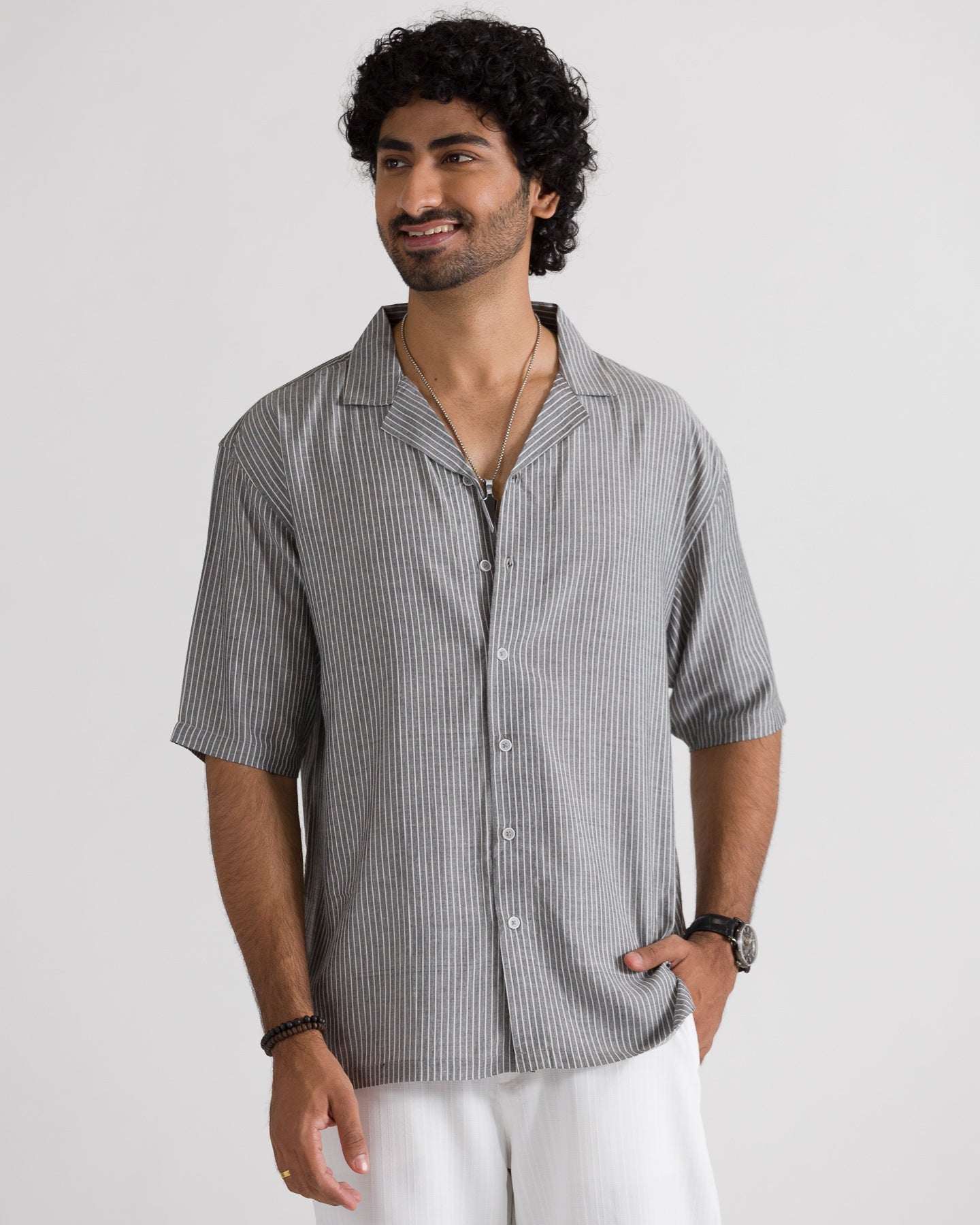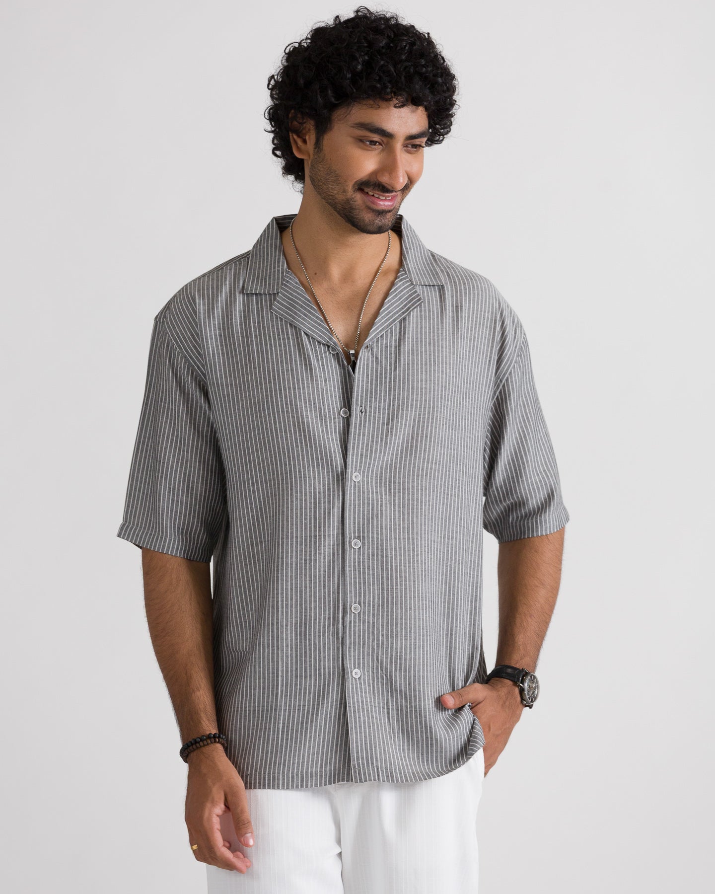 Men’s Graphic Back Printed Cuban Collar Shirt made from lightweight, breathable cotton fabric for superior comfort. Features a relaxed Cuban collar, stylish stripe pattern, and bold graphic back print for a modern streetwear look. Designed for summer wear, casual outings, and everyday styling with a soft, airy feel.