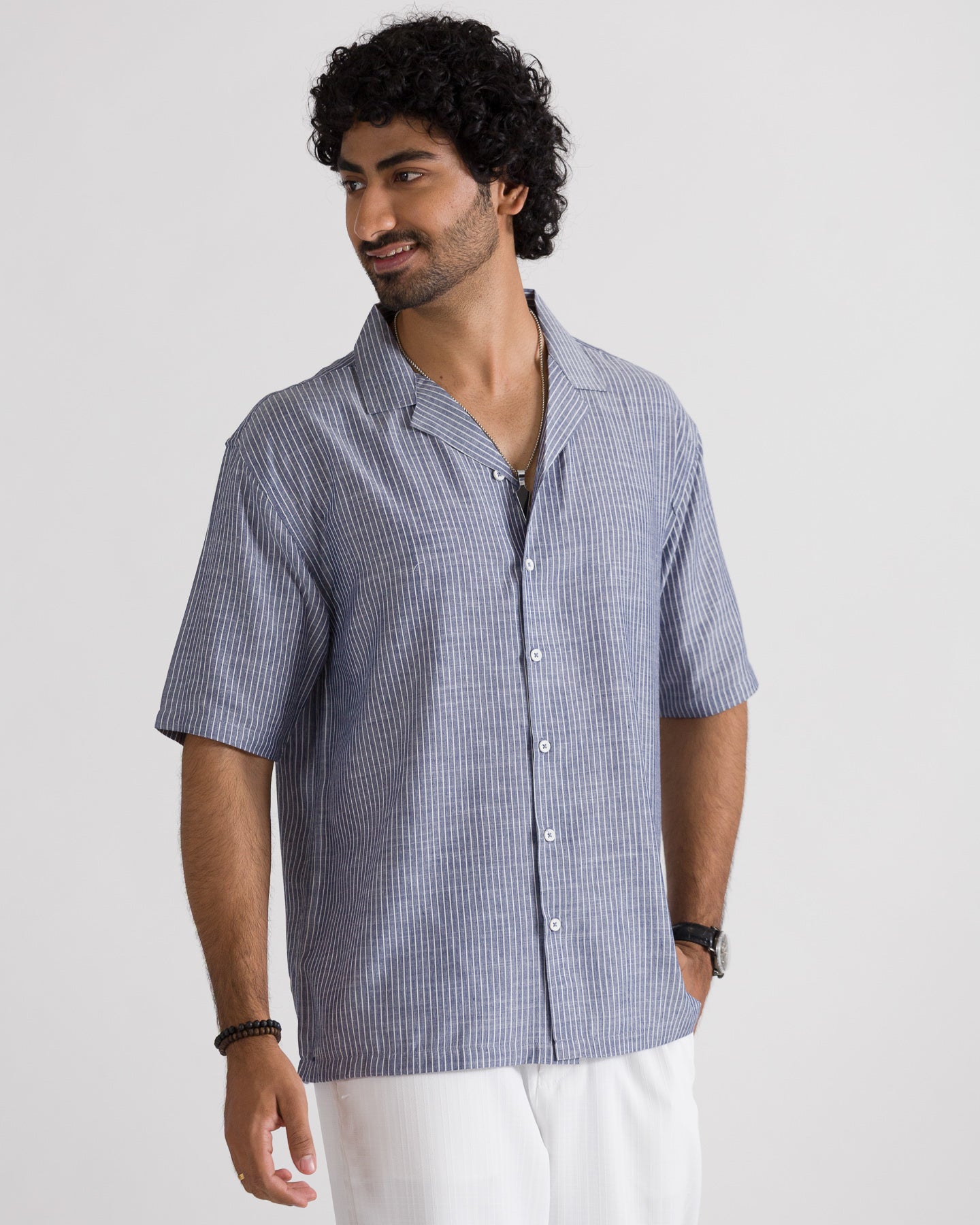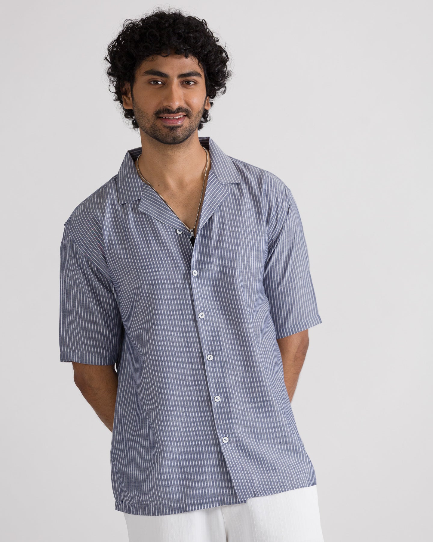 Men’s Graphic Back Printed Cuban Collar Shirt made from lightweight, breathable cotton fabric for superior comfort. Features a relaxed Cuban collar, stylish stripe pattern, and bold graphic back print for a modern streetwear look. Designed for summer wear, casual outings, and everyday styling with a soft, airy feel.